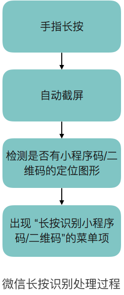 當微信檢測到用戶長按識別的時候,會第一時間把當前屏幕截屏,然后去檢測屏幕截圖是否有小程序碼(或二維碼),如果有,則出現長按識別小程序碼(或二維碼)的菜單項,點擊該菜單項即可跳轉到對應的小程序碼(或二維碼對應的內容);反之如果截圖里面沒有小程序碼(或二維碼),又或者小程序碼(或二維碼)圖案不完整,則不會有識別結果。