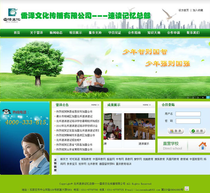 雷澤文化傳播有限公司總部位于河北省省會——石家莊,是一家專門從事學習方法培訓、項目研發、市場推廣的大型特色教育機構,自年成立以來,自主研發了《北禾速讀速記教學法》等提升中小學生特長能力的系列教程,受到社會各界的普遍關注和認可。公司始終堅持學生素質和能力教育、教學方法的研究開發、培訓推廣及相關產品的研制經營工作。是目前國內專業從事此領域研究與應用的教育機構之一。