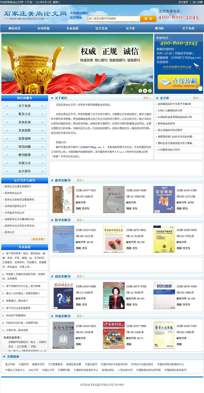 石家莊美尚論文網,收錄和整理了近萬本學術期刊,為需要論文發表的朋友,提供大量的學術期刊參考數據,更加準確地選擇與自己專業對應的學術期刊,以安全的方式,建立與雜志社順利溝通的橋梁,更加有效投稿,快捷發表中國期刊,收錄學術期刊數據最全的網站。主要處理朋友們的來稿,對稿件進行分類,對應相應的期刊,安排合理的欄目,確定版位和刊期,保證您的文章及時見刊。